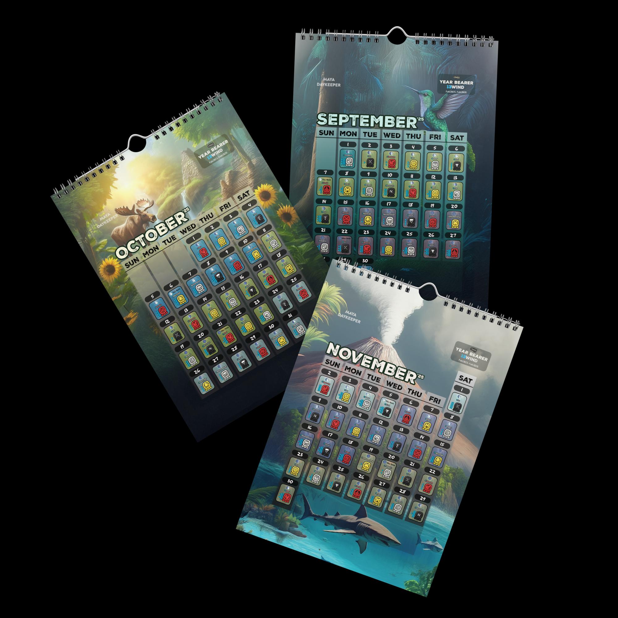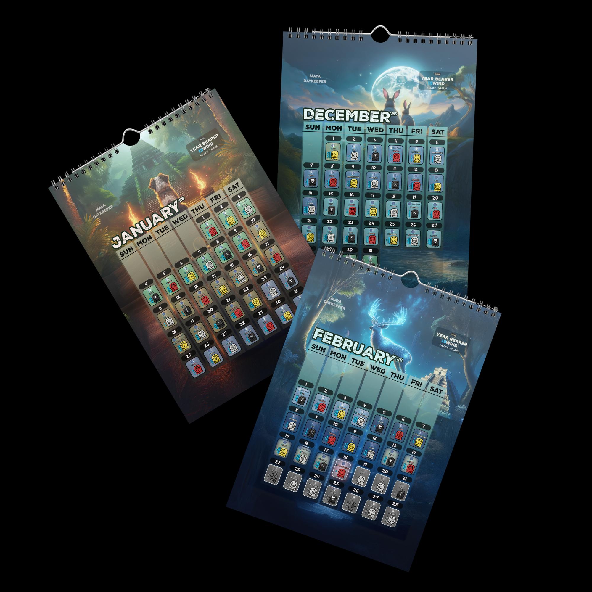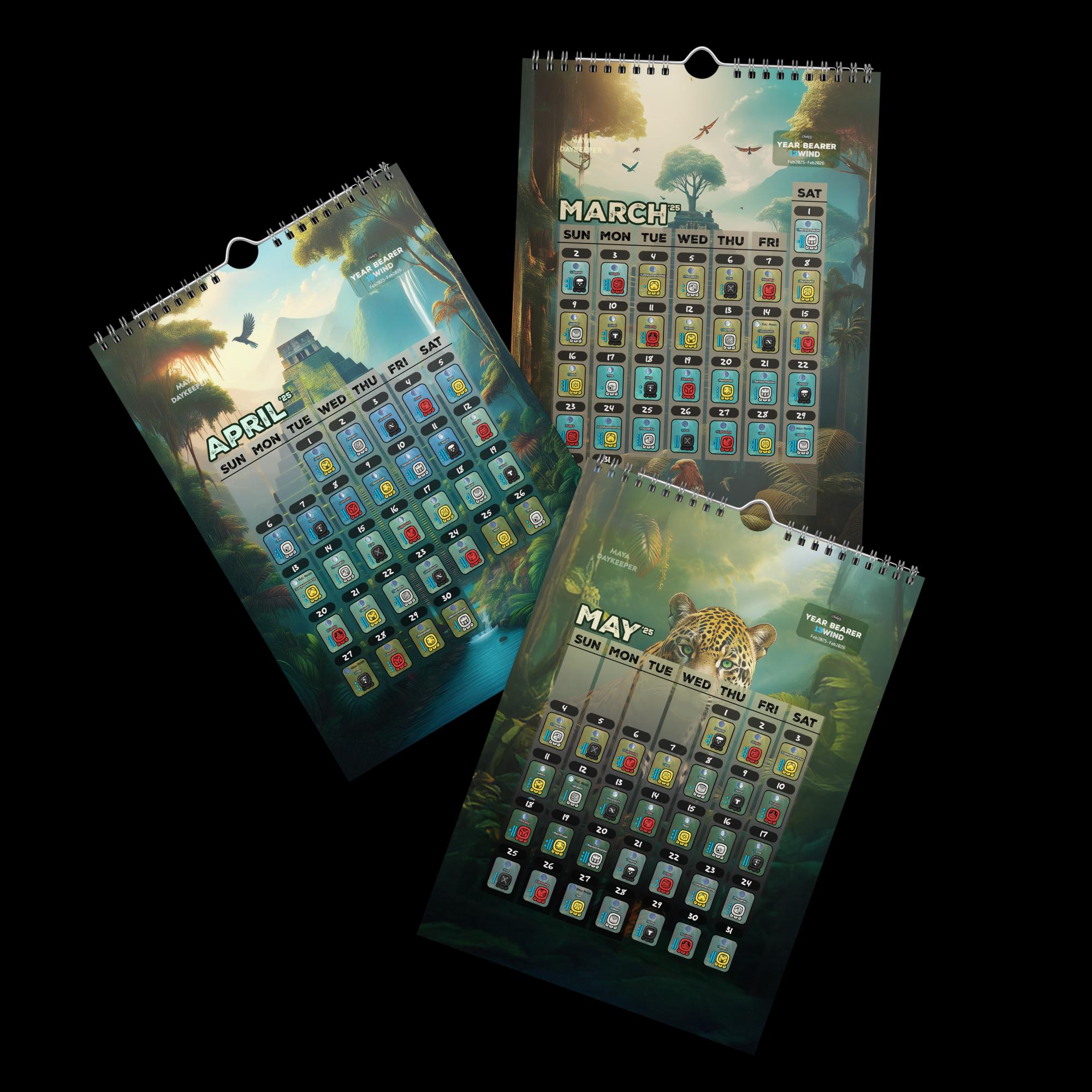 Keep track the 13Wind Maya Year (Feb2025-Feb2026). Follow the Maya Calendar (Cholq’ij/Tzolkin) in these 13 pages that showcases the Nawals(day energies), and the trecenas (13-days cycle) differentiated by colours.